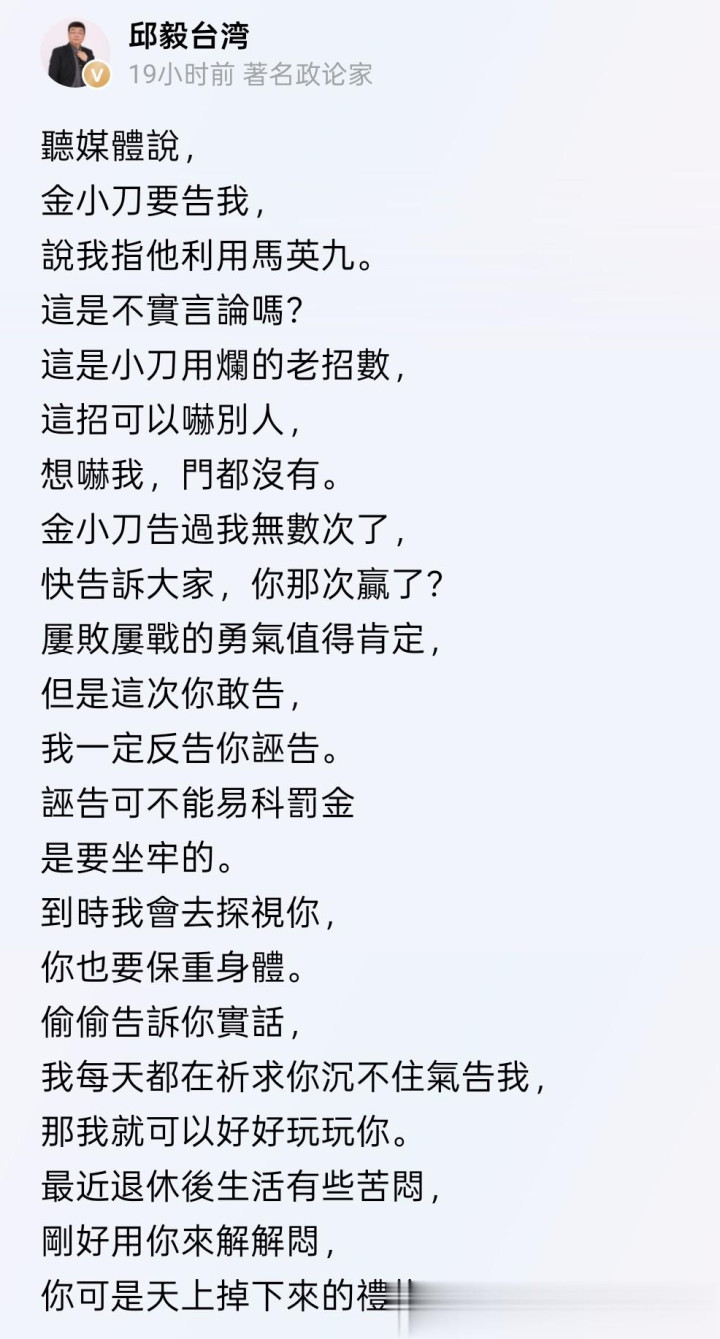 邱毅随即强势回击,火药味十足。嘲讽金溥聪“告过无数次,从没赢过”。当场放话:“你敢告,我就反告诬告!坐牢我去探视你。”
